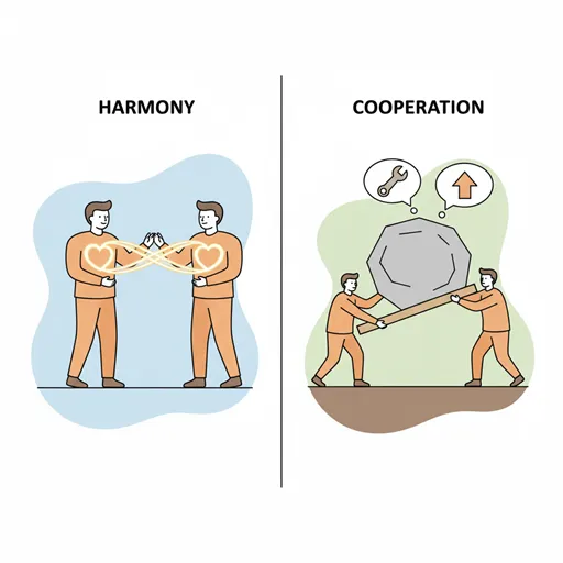 「協調」という言葉は、**「チームのメンバーが、互いの違いを認めつつも、全体の和を保ち、心理的な安定を最優先する」**というニュアンスが根本にあります。それは、**摩擦を避けて円滑な状態を維持する**ための、主に心理的・感情的なアプローチです。